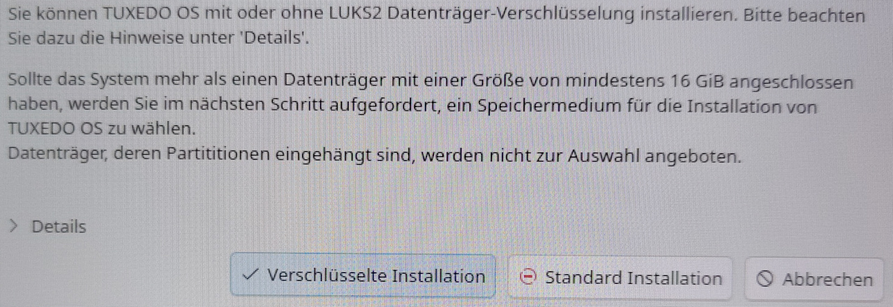 Mit frischem Backup ging es im Anschluss an das Eingemachte. Wieder in das Live-System von Tuxedo OS gebootet musste Linux Mint nun weichen, wobei ein Assistent die Schritte begleitet. Zum Start der Installation "TUXEDO OS installieren" in der oberen linken Ecke klicken.