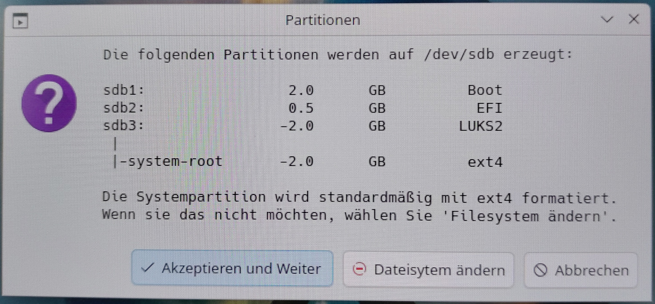 Der Installationsassistent fragte, ob ich eine Parallel-Installation zu Linux Mint wünschte oder ob es gelöscht werden kann. "Datenträger löschen" it is. Den anschließenden Partitionierungsvorschlag nahm ich mangels besserer Idee unverändert an. Schließlich gab ich noch das Kennwort für die Verschlüsselung ein.