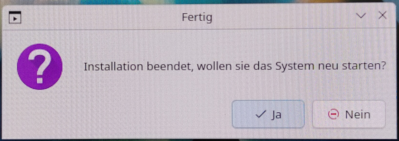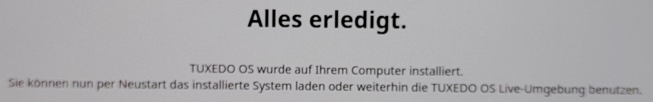 Nach etwas Wartezeit war auch diese Prozessfolge abgeschlossen und anschließend übernahm das "Tuxedo OS Installationsprogramm". Hier wird man erneut nach Sprache, Tastaturlayout, Zeitzone, etc. gefragt. So folgt man den finalen Anweisungen des Assistenten und ehe man sich versieht ist "Alles erledigt" und es steht die Frage im Raum, ob man das frisch installierte System neu starten möchte.